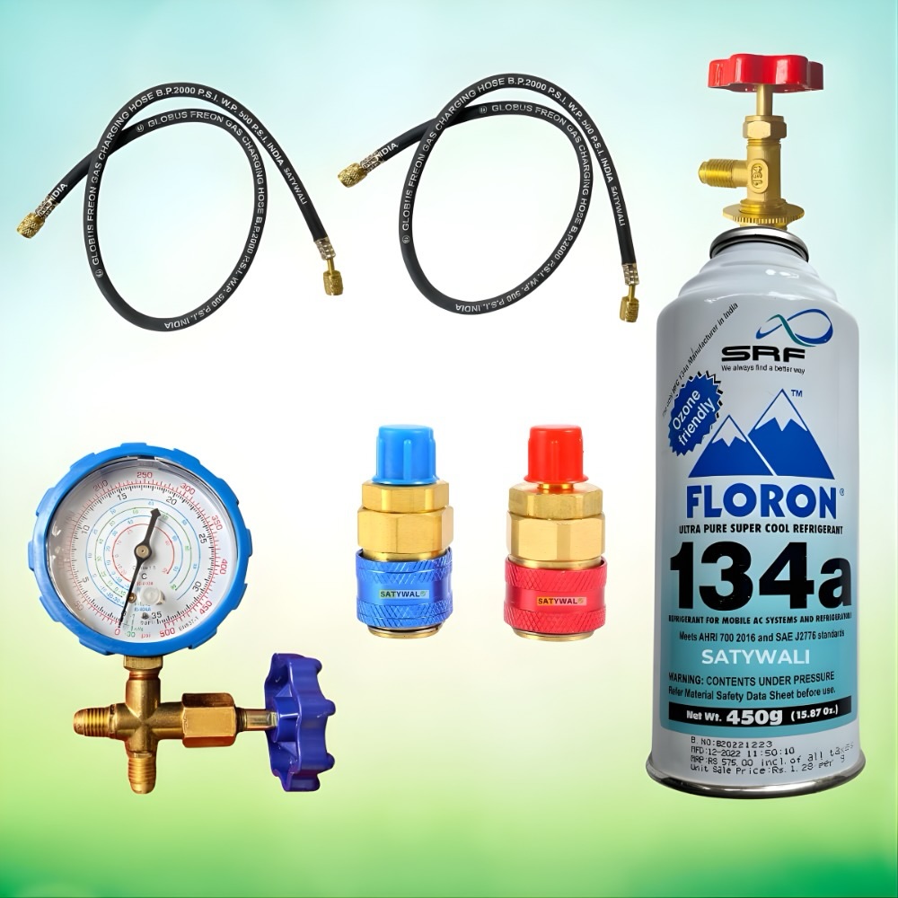 Car AC Combo Set 1 Can Valve, R-134A Gas Charging Adaptor, 2 Hose Pipes & Single Gauge Manifold